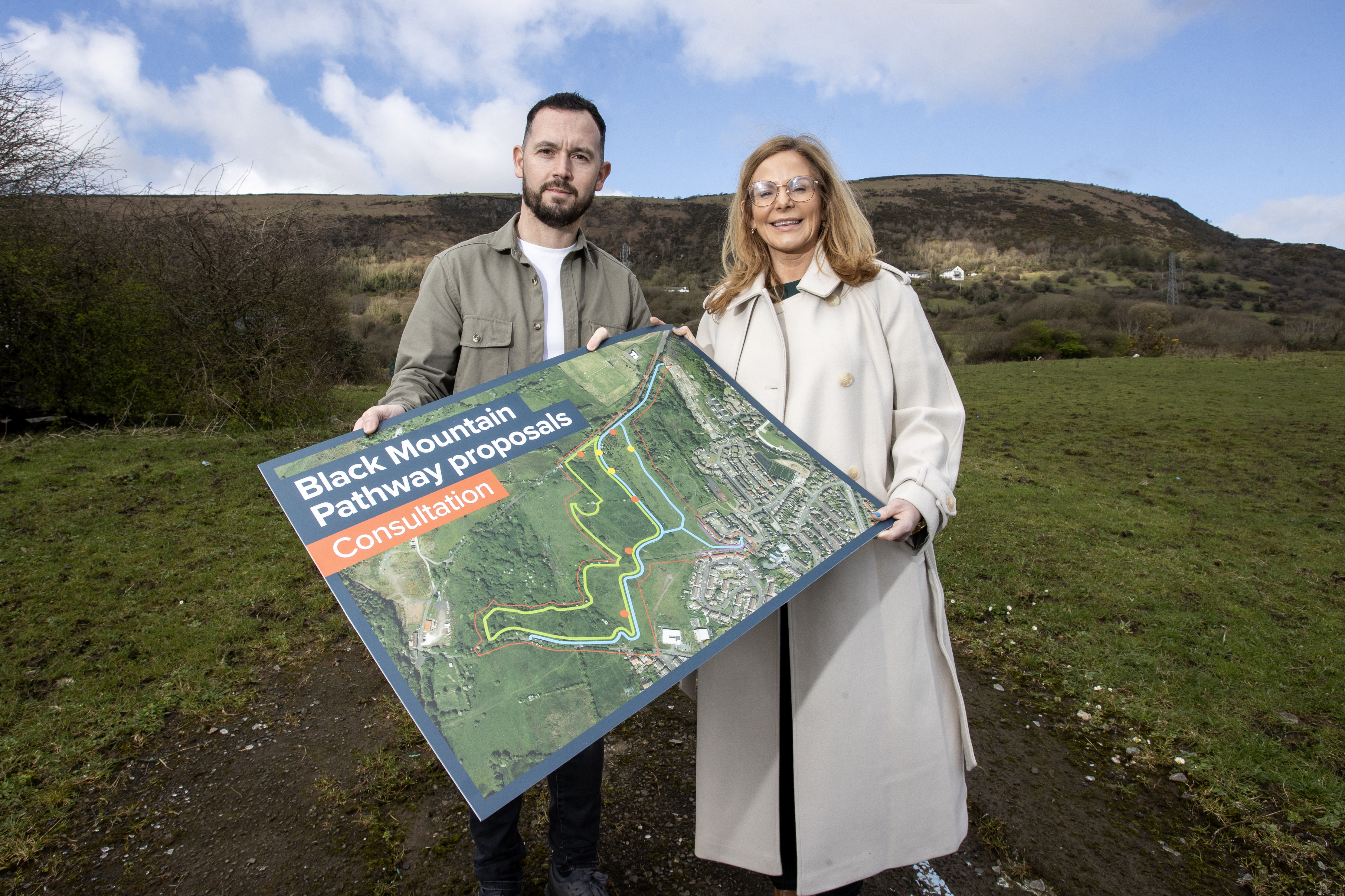 Micheal Donnelly from Upper Springfield Development Trust and Councillor Christina Black on Black Mountain with photo prop and text Black Mountain consultation