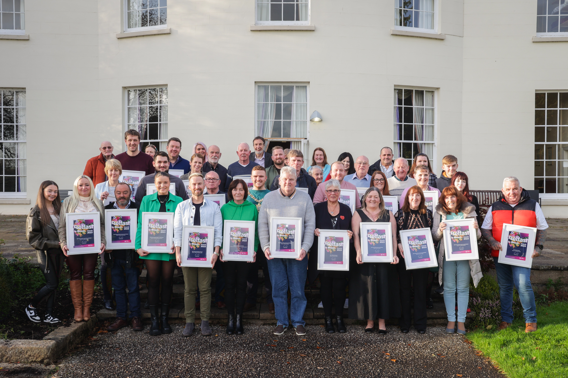 Belfast in Bloom 2023 award winners with Lord Mayor of Belfast Councillor Ryan Murphy at Malone House.