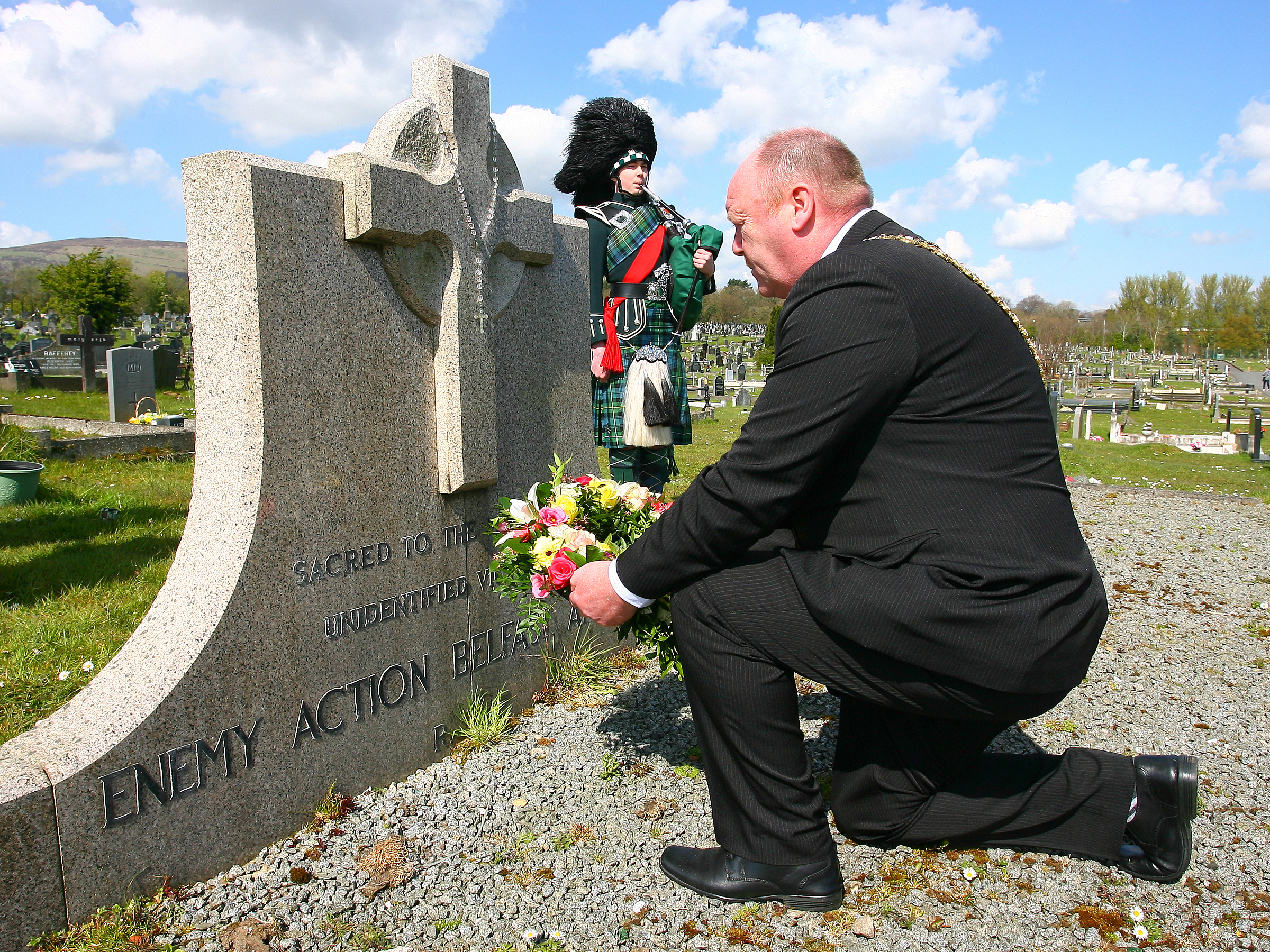 The Lord Mayor of Belfast Alderman Frank McCoubrey and trustees of the Northern Ireland War Memorial today placed wreaths on two mass graves in Belfast’s City Cemetery and Milltown Cemetery to remember those who lost their lives in the Blitz.